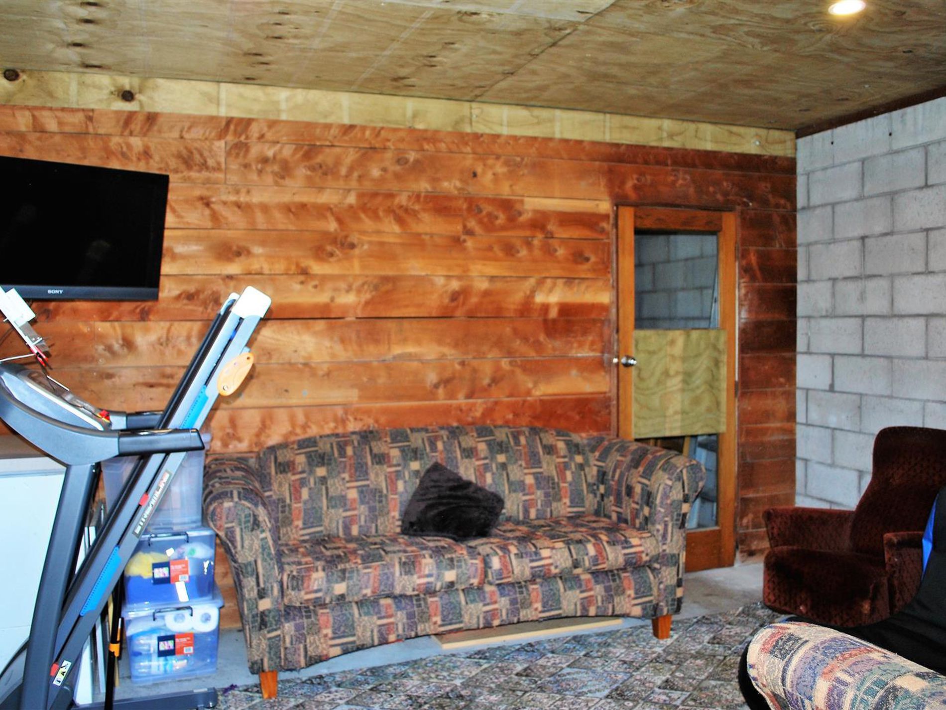 Block built oversized single garage houses a woodshed & a well-used games room.