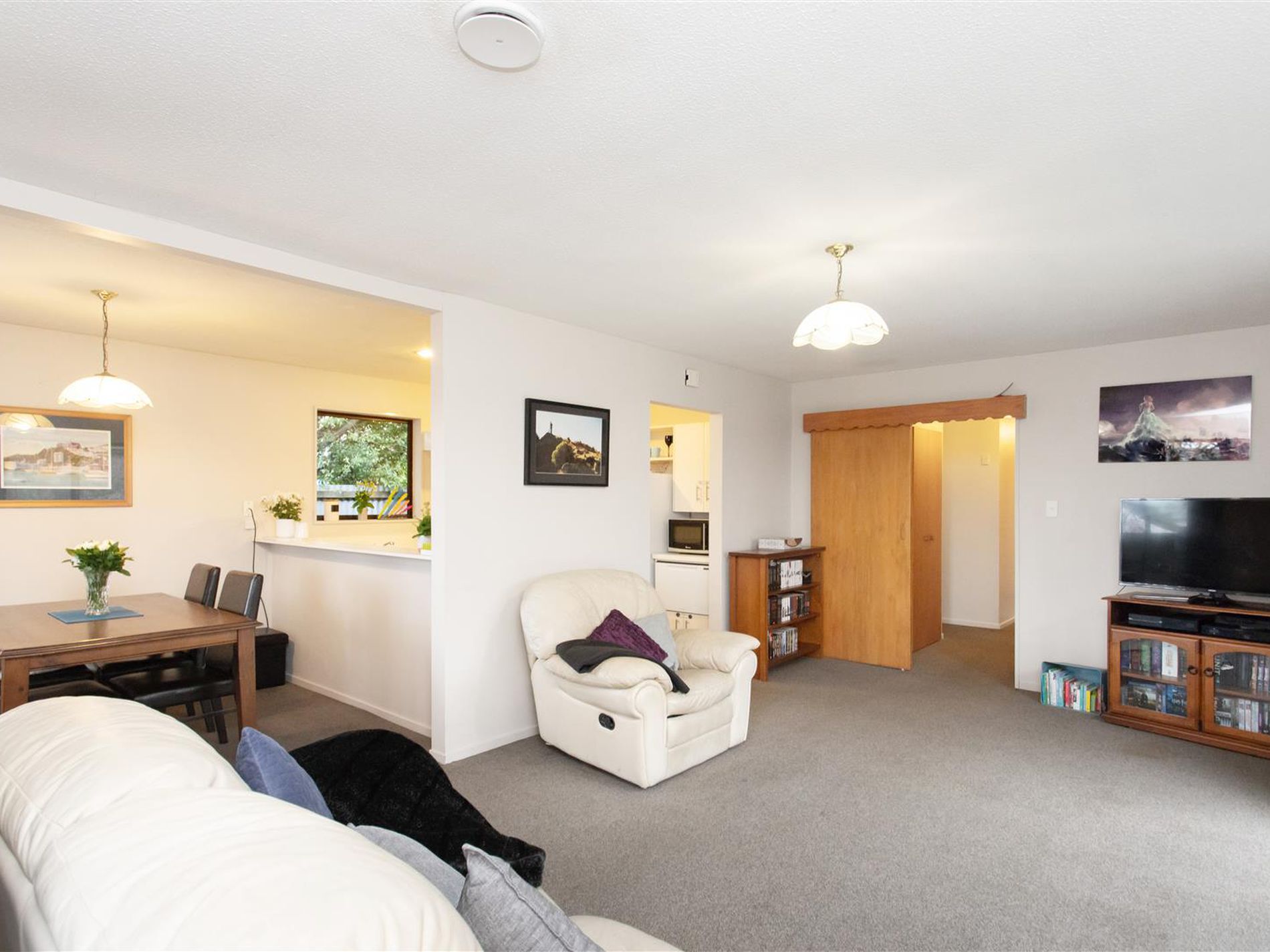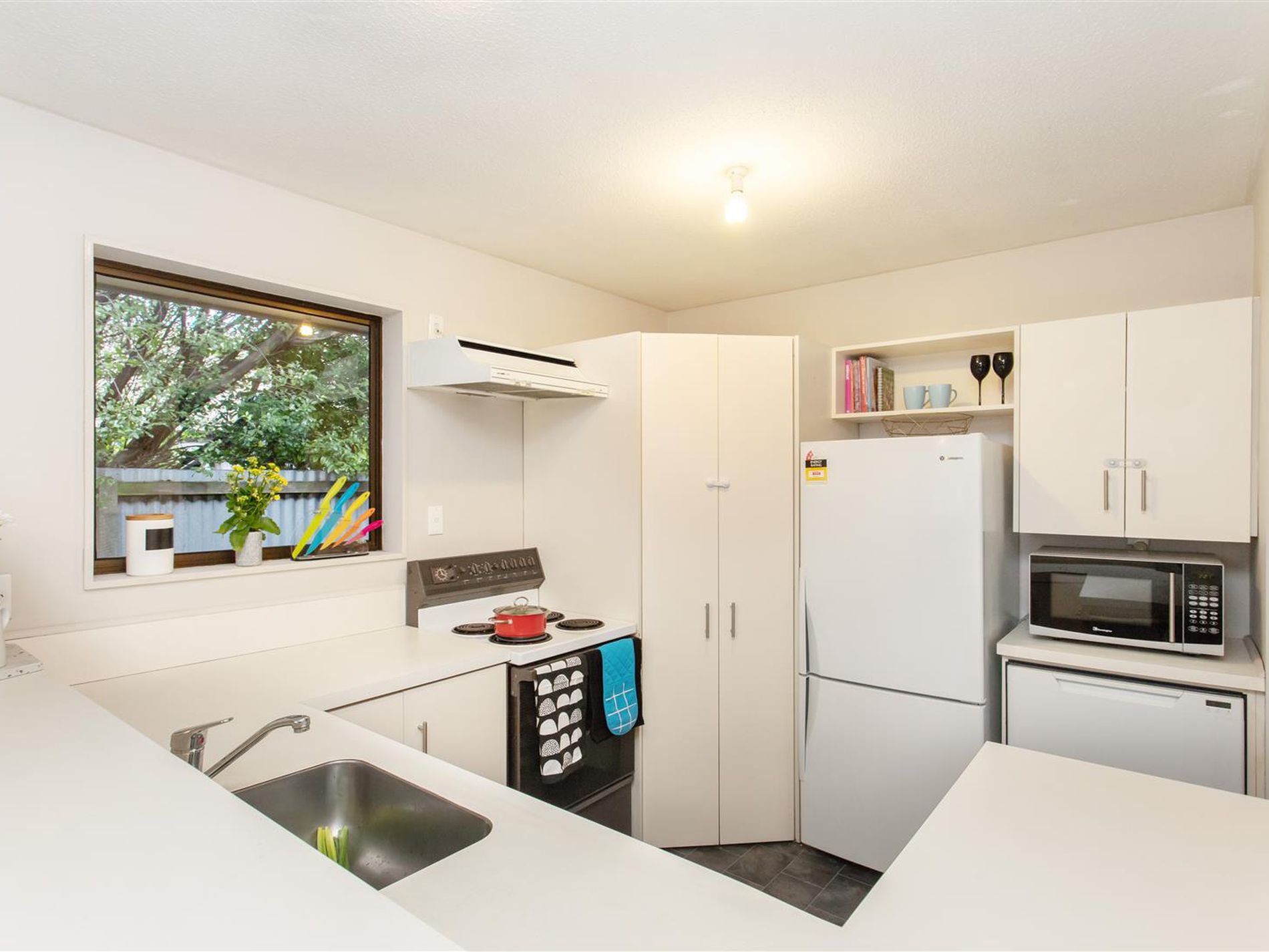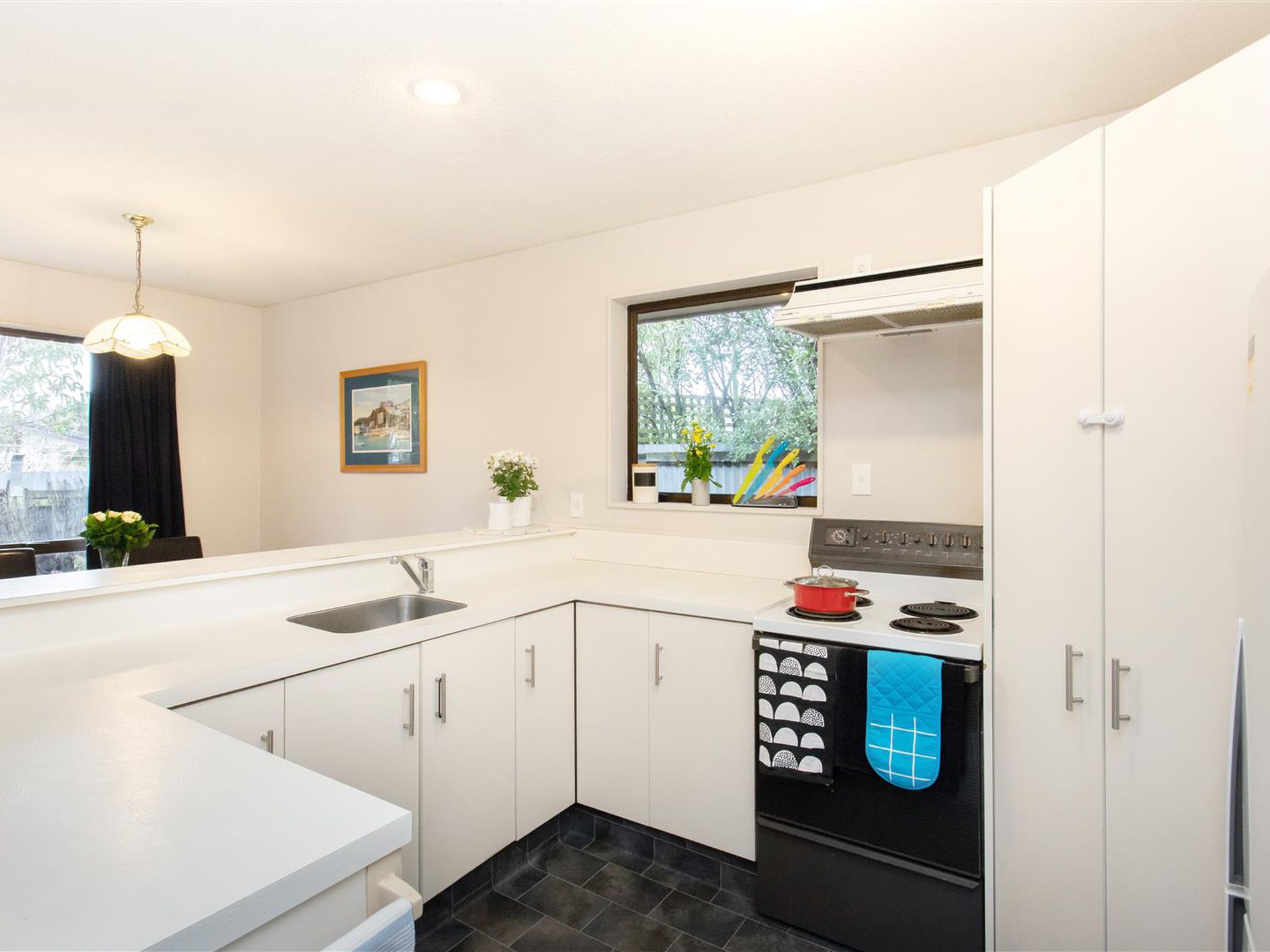 Kitchen is kitted out with all the expected conveniences and has an open plan dining space.